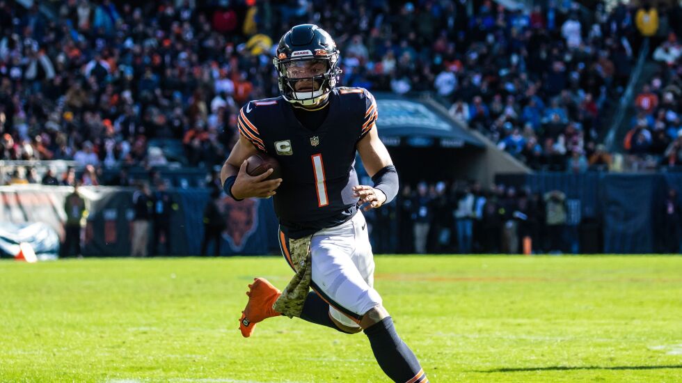 On the next drive, Fields took a shotgun snap third-and-2, faked a handoff and ran to the right behind Kmet, who had gone in motion. Fields split safety JuJu Hughes and linebacker Alex Anzalone and dashed left of safety Kerby Joseph at the Bears’ 39. No one could catch him.