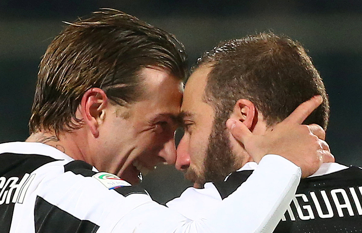 Soccer Football - Serie A - Fiorentina vs Juventus - Stadio Artemio Franchi, Florence, Italy - February 9, 2018 Juventus’ Federico Bernardeschi celebrates with Gonzalo Higuain after scoring their first goal REUTERS/Alessandro Bianchi