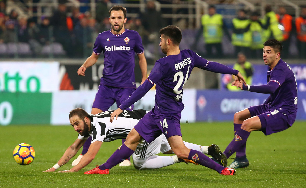 Soccer Football - Serie A - Fiorentina vs Juventus - Stadio Artemio Franchi, Florence, Italy - February 9, 2018 Juventus’ Gonzalo Higuain in action with Fiorentina's Marco Benassi and Giovanni Simeone REUTERS/Alessandro Bianchi