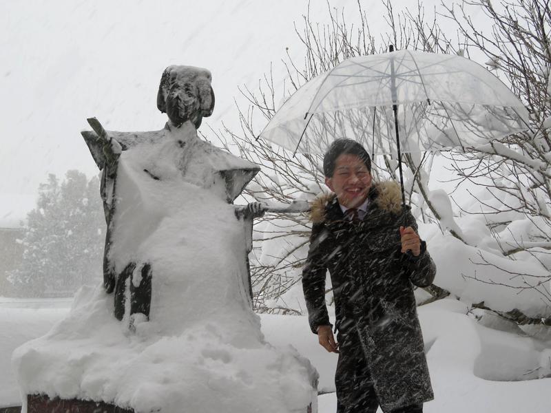 Kanazawa had the heaviest snowfall in 30 years on the day he visited. After removing snow from the statue of Shiraito, Kazutaro smiled and said, "It's another memorable experience for me."