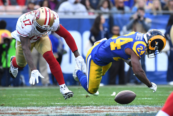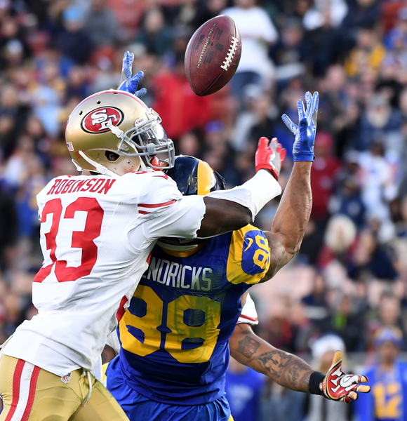 The Rams' hopes for a possible game-winning field goal ended when Rashard Robinson intercepted Goff's pass.
