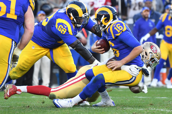 Despite Goff's struggles _ he was sacked four times _ he positioned the Rams for victory by connecting with rookie tight end Tyler Higbee for a touchdown with 10:32 left.