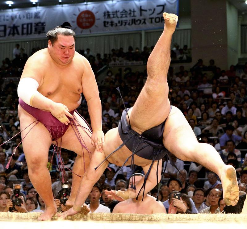 In other action, sekiwake Mitakeumi won a battle of raw power with No. 5 maegashira Kotoshogiku when he blasted off the line and bulldozed straight ahead for his kachikoshi eighth win, securing his rank for another tournament.