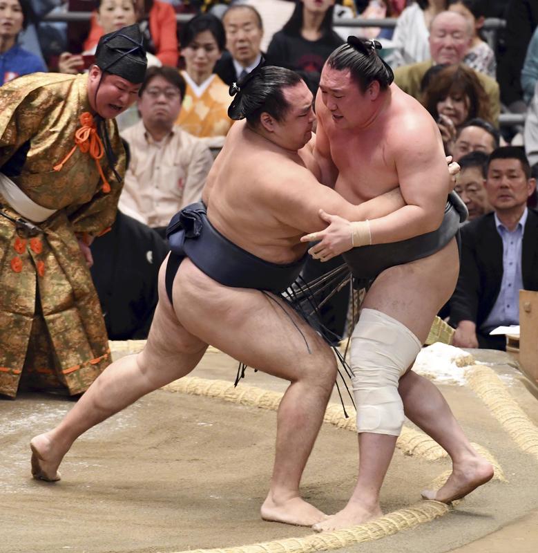 No. 3 maegashira Takakeisho (2-2) sent sekiwake Tochinoshin to his second loss of the tournament. Takakeisho nearly went to the surface at one point, losing his balance, but recovered enough to pull down the sekiwake while retreating along the bales.