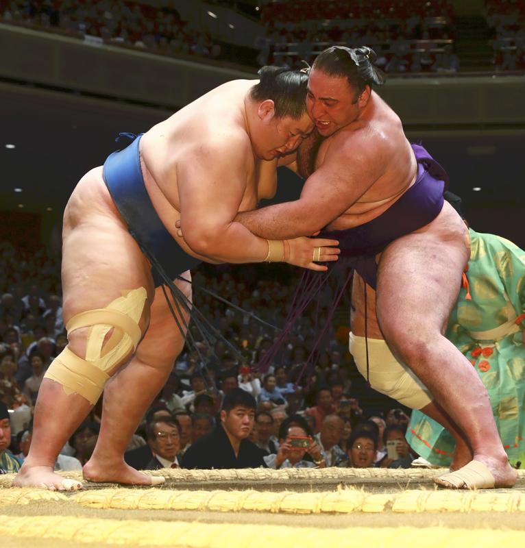 Takayasu was pushed out by No. 3 maegashira Tamawashi (3-3), while Goeido was pulled down by No. 3 maegashira Chiyotairyu (2-4).