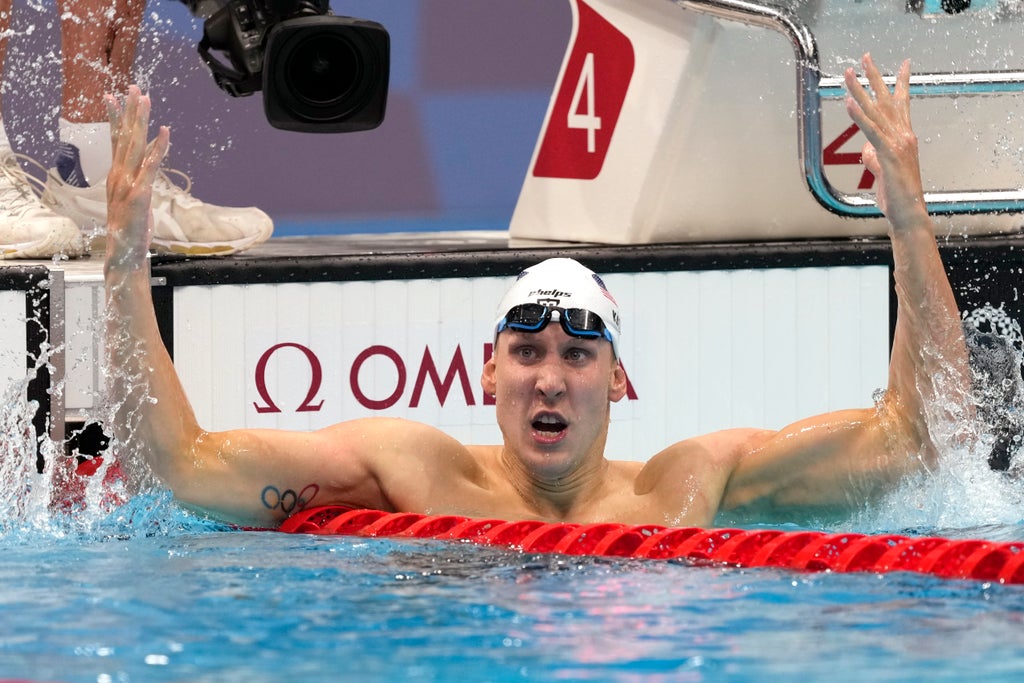 Kalisz flexed his muscles and then climbed atop the lane rope, splashing the water while a contingent of his teammates cheered him from the stands of the nearly empty Tokyo Aquatics Centre.