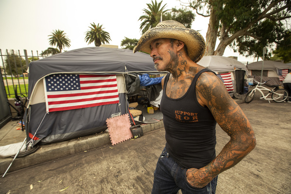 Tents with American flags hanging on them and a homeless encampment situated on the grounds of the West L.A. veterans hospital sit within jarring proximity to some of the most coveted real estate in the country — at the base of a hill where the Getty Center's travertine surfaces glow in the sun.