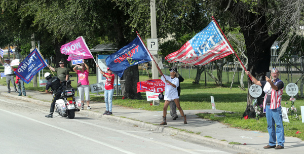 Trump supporters demonstrate on West Colonial Drive as the motorcase of Democratic vice presidential nominee Sen. Kamala Harris arrives for an early-voting event at the Central Florida Fairgrounds, Monday, October 19, 2020. (Joe Burbank/Orlando Sentinel/TNS)