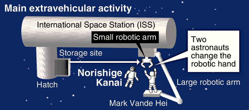 Together with American astronaut Mark Vande Hei, Kanai removed two hand-like contraptions called Latching End Effectors (LEE), which are attached to the ends of robotic arms connected to the ISS for the purpose of grabbing objects. Kanai replaced one LEE with a new unit brought from an onboard storage location.