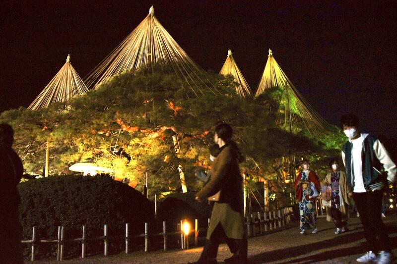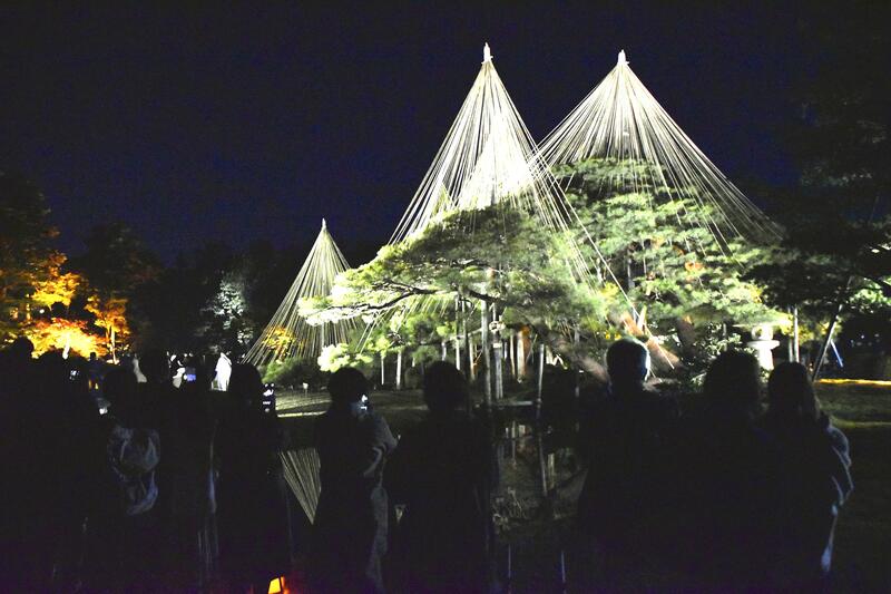 KANAZAWA -- Visitors view autumn foliage lit up during an illumination event at Kenrokuen garden in Kanazawa on Saturday. Bathed in the light of about 64 floodlights and about 170 paper lanterns, Kenrokuen, often cited as one of Japan's three great gardens, has an enchanting atmosphere. The pine trees are tied using a technique called yukitsuri to provide protection from the heavy winter snows. The event runs from 5:30 p.m. to 9 p.m. through Nov. 28, and admission is free during these hours.