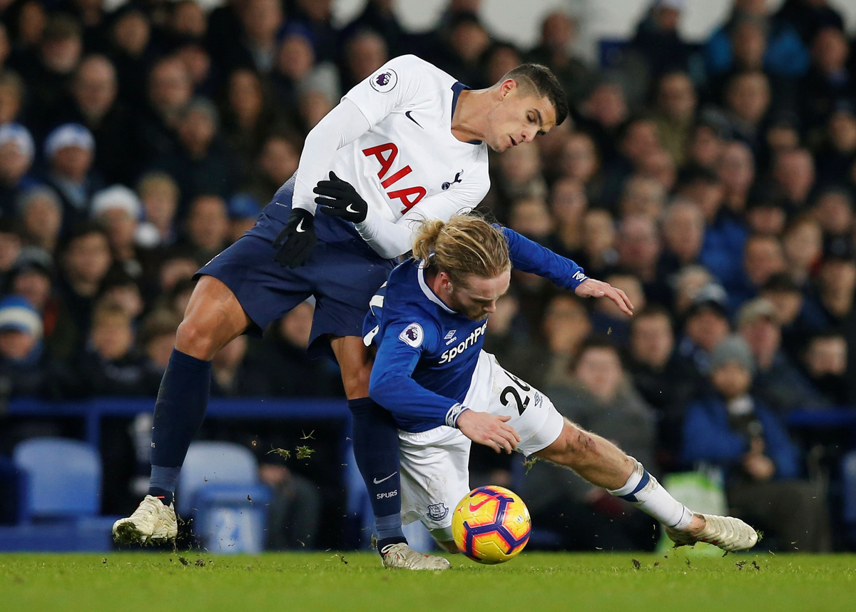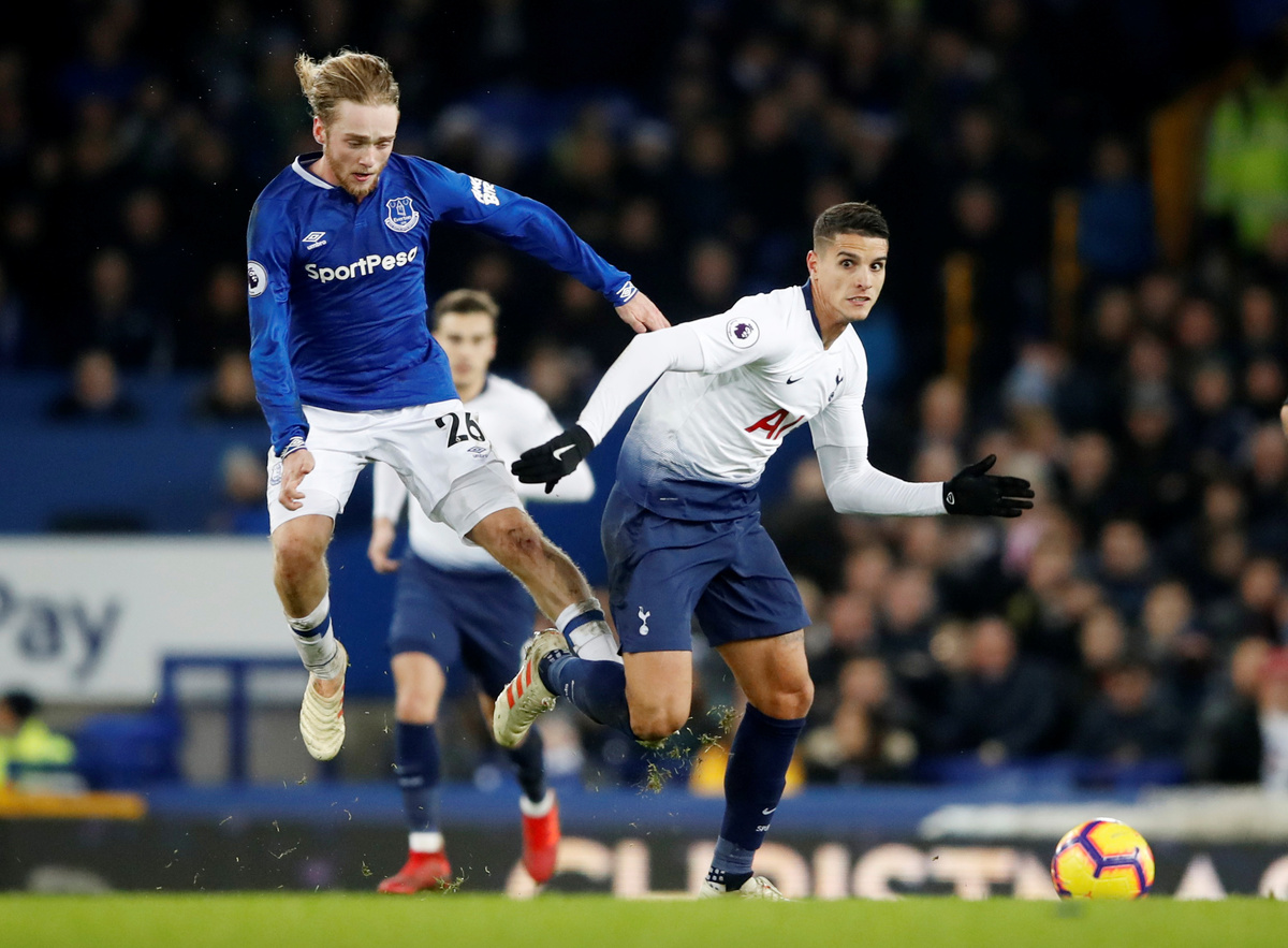 After Calvert-Lewin had a header harshly ruled out, Spurs drew level from an awful mix-up between Everton keeper Jordan Pickford and defender Kurt Zouma with South Korean Son doing well from a tight angle to curl the ball into the unguarded goal.