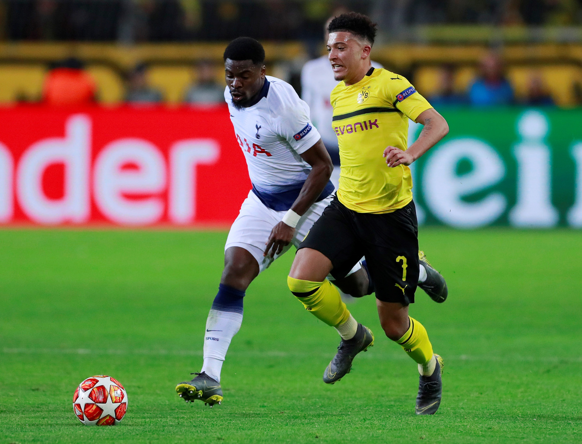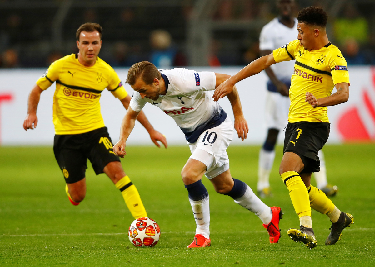 Soccer Football - Champions League - Round of 16 Second Leg - Borussia Dortmund v Tottenham Hotspur - Signal Iduna Park, Dortmund, Germany - March 5, 2019 Borussia Dortmund's Jadon Sancho and Mario Goetze in action with Tottenham's Harry Kane REUTERS/Wolfgang Rattay