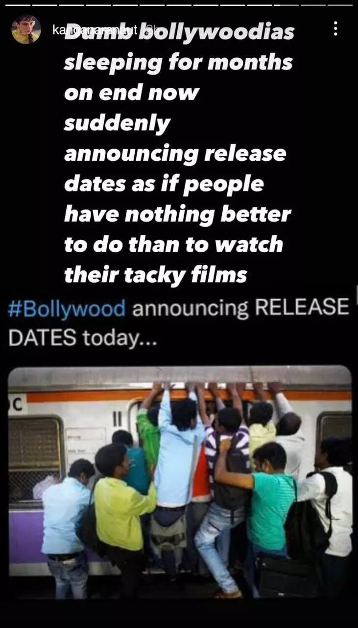 Actress Kangana Ranaut took to her Instagram handle to react to Bollywood celebs announcing the release dates of their upcoming films.