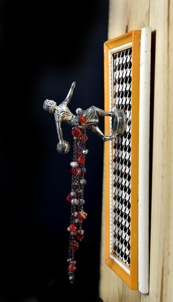 He showed me a number of items in his home that he'd created including a jewel-encrusted cow skull; colorful hooks made from old metal trophy figurines that looked like they were scaling his bedroom wall; an old stereo speaker turned colorful cabinet; a jewel-like chandelier made from used tasting spoons he got from Murray's Ice Cream in Westport; and a 7-foot-tall, mind-bogglingly intricate architectural model of a 42-story skyscraper made from foam core, aluminum and dowel rods discarded from a sign shop. He's since installed electricity in it.