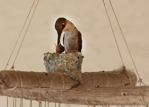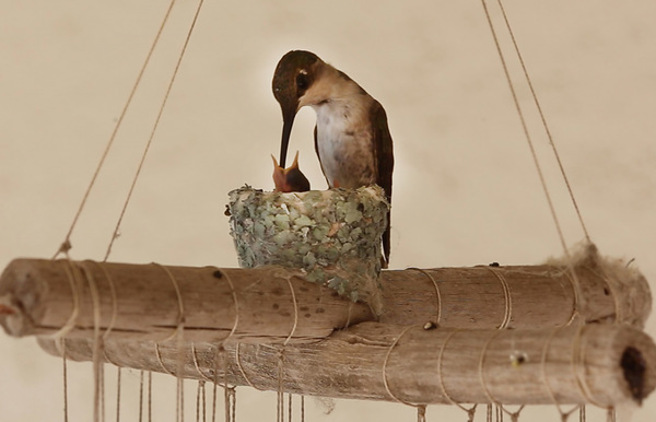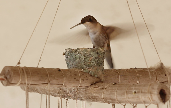 Ruby built her nest atop some wind chimes beneath the eaves of their house, a few feet from several windows.