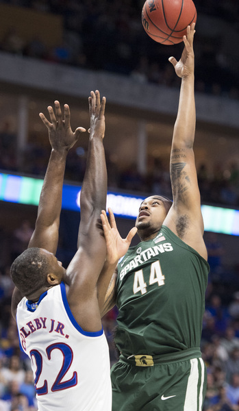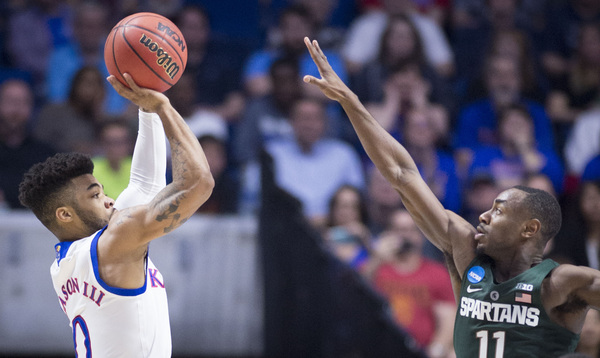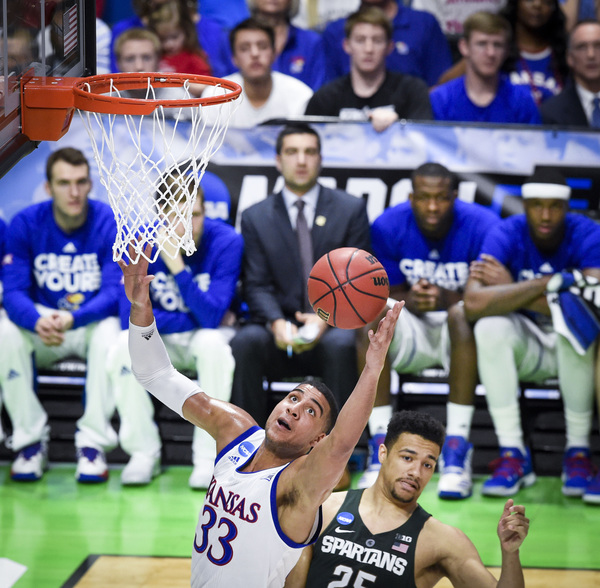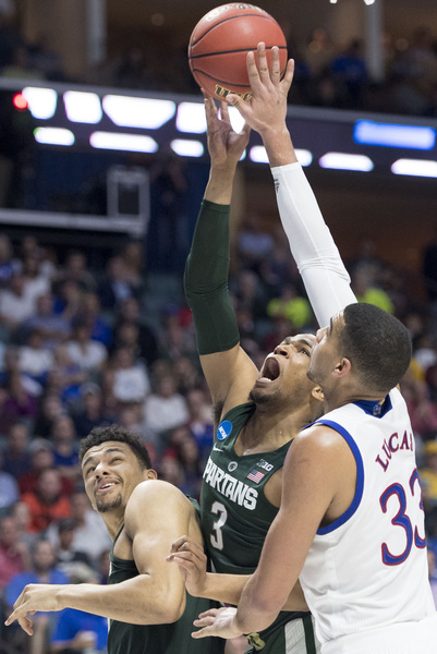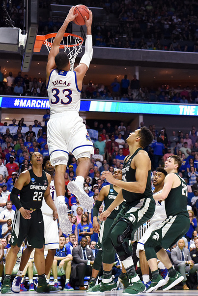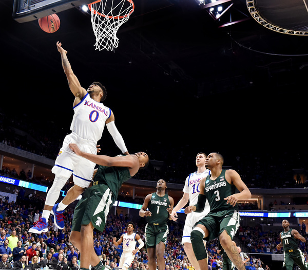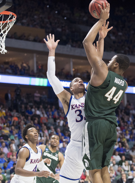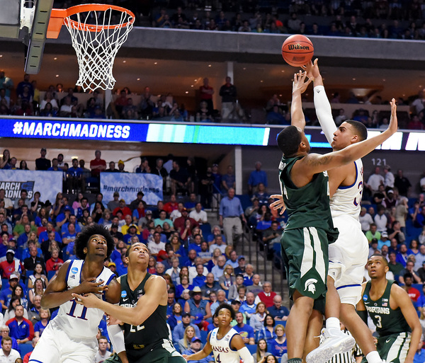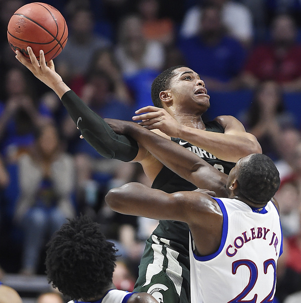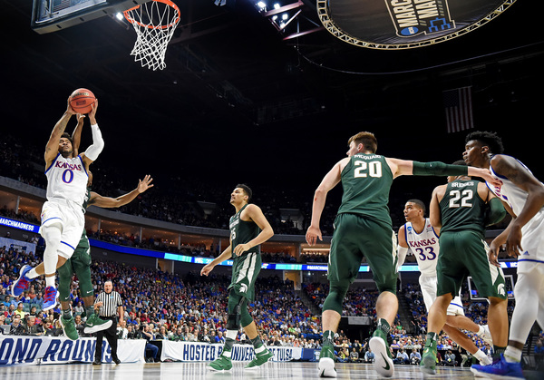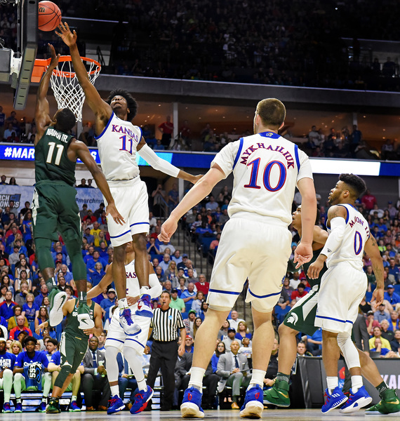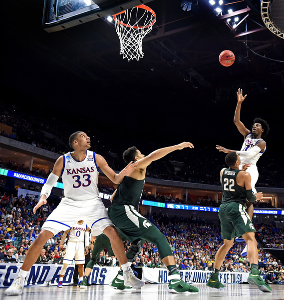 Bridges, who had 13 points the first half, scored five points as the Spartans led, 9-6, at 15:29. The Jayhawks led 17-12 at 11:51 following a 3 by Mykhailiuk and two from Graham. However, the Spartans rolled 8-2 and led, 20-19, at 9:41. The Jayhawks went on their 13-2 run right after a controversial play in which Nick Ward scored on a bucket that appeared to possibly be charge. Ward missed the ensuing free throw after officials went to the monitor.