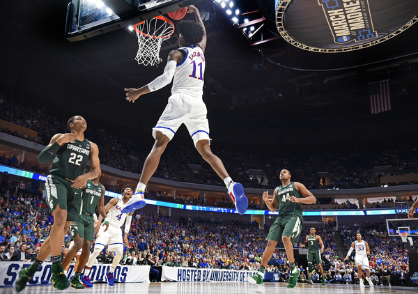 KU survived a mistake by Vick, who slammed at 7:27 off a lob from Graham to give the Jayhawks a 69-59 lead. However, he barked as a Spartan player following the dunk and was called for a technical. Cassius Winston hit two free throws and Matt McQuiad hit a 3 to cut KU's lead to 69-64 at 7:11.