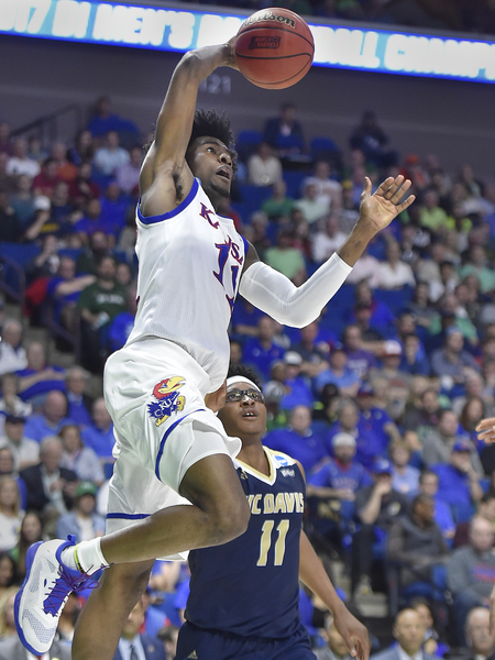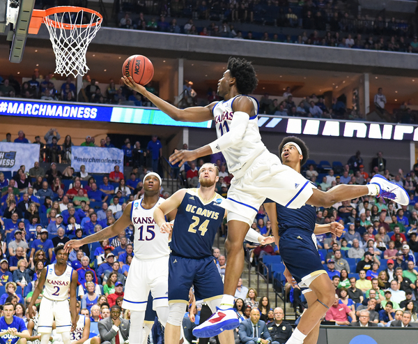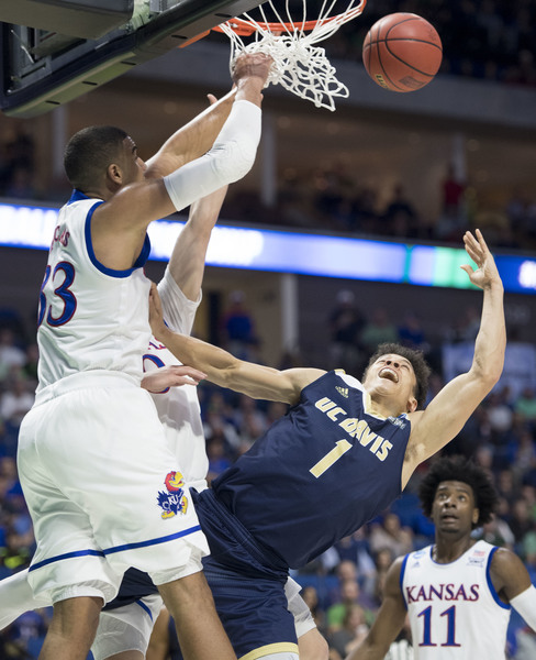 Mason, Jackson and Graham had 11 points apiece the first half, while Mykhailiuk had nine. Moneke and Schneider had 10 apiece for UC Davis, which hit 9 of 32 shots (.281) in the first half (1 of 6 3s, 9 of 11 free throws) to KU's 18 of 32 (.563). KU was 5 of 14 from 3 the first half and 9 of 11 from the line. Led by Lucas and Mason, who had eight and five rebounds, respectively, KU outboarded the Aggies 50-28 the first half.