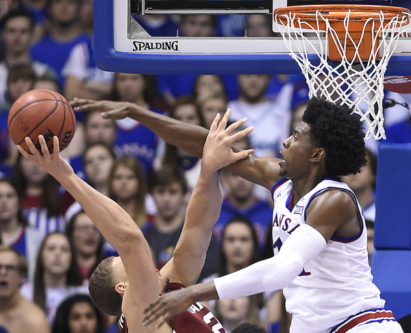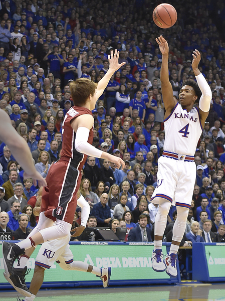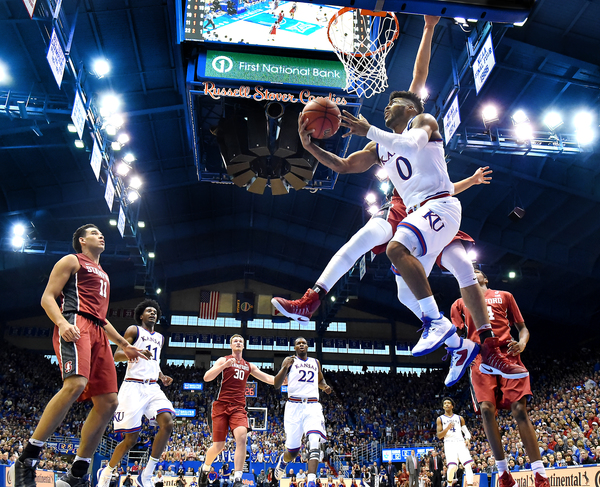 In addition, Josh Jackson rammed home a vicious one-handed slam off a pass from Graham the second half and totaled 13 points. Also, Svi Mykhailiuk went for 13 points including 10 straight (and 13 of his team's 14) the second half as Kansas opened an 84-66 lead with 3:28 left.