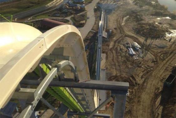 In early tests, rafts carrying sandbags flew off the slide, prompting engineers to tear down half the ride and reconfigure some angles.