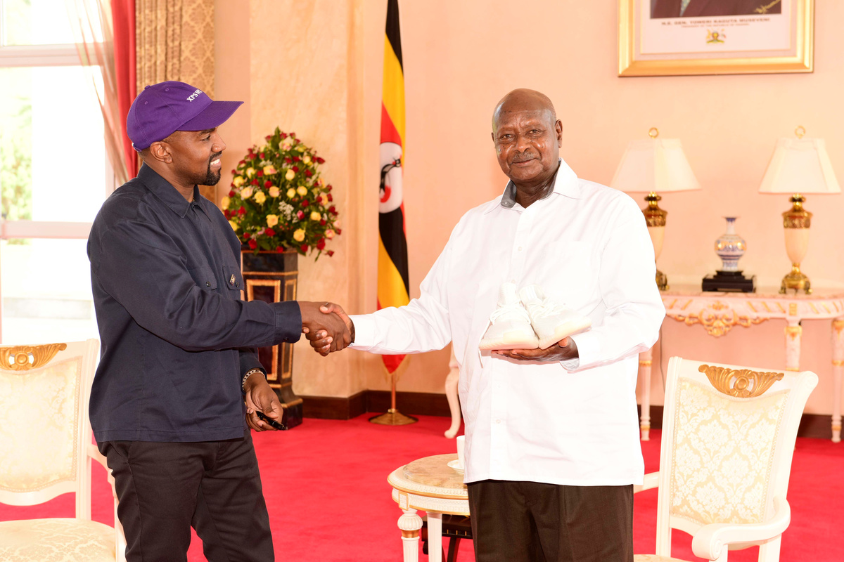 Days after a rambunctious meeting with U.S. President Donald Trump at the White House, a more subdued West presented Yoweri Museveni with a pair of white sports shoes made by his own company that he and Kardashian then signed with a marker pen.