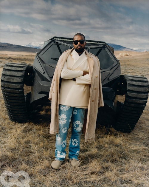 There are a lot of outlandish details to unpack about GQ's May/Ye cover story. Like Kanye's fleet of matte black vehicles, including at least three Lamborghini Urus, an "army" of Ford F-150 Raptor pickup trucks, ten Russian-made SHERP ATVs, and a massive military-grade tank. West posed on the tank for GQ's cover shot.