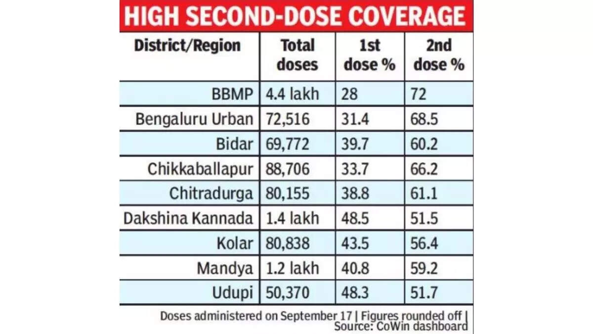 CoWin dashboard data shows BBMP, Bengaluru Urban, Chikkaballapur, Chitradurga, Dakshina Kannada, Kolar, Mandya and Udupi districts administered a higher number of second doses than first.