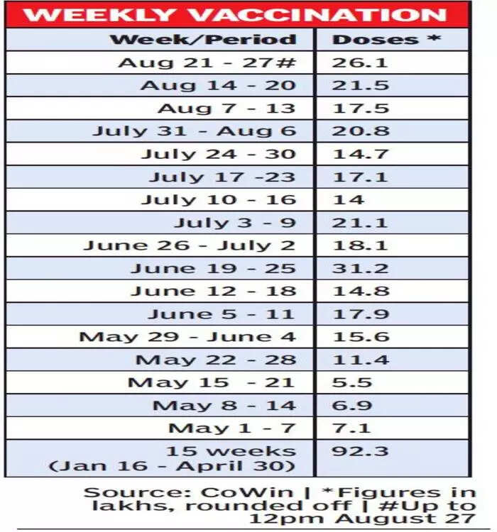 The government, as reported by TOI earlier, has set itself a daily target of five lakh doses a day, but has been stymied by supplies from the Centre. With available doses, the state has administered an average of 3.7 lakh doses on each day between August 21 and 27 (up to 12pm).