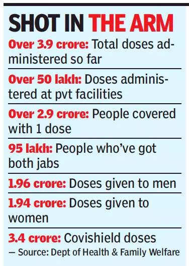 Of the 3.9 crore doses administered, Chandra said, 52 lakh, or around 13% of the shots, were given at private facilities. More than 1.96 crore doses have been given to men and more than 1.94 crore to women.
