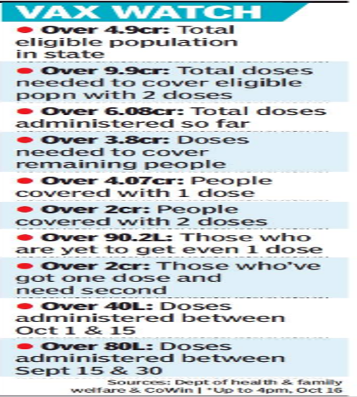 Between October 1 and 15, the state administered a total of over 41.1 lakh doses, which is only half of the over 81.9 lakh doses administered between September 15 and 30. Of those administered so far in October, more than 26.7 lakh were second doses, while over 14.3 lakh were first.