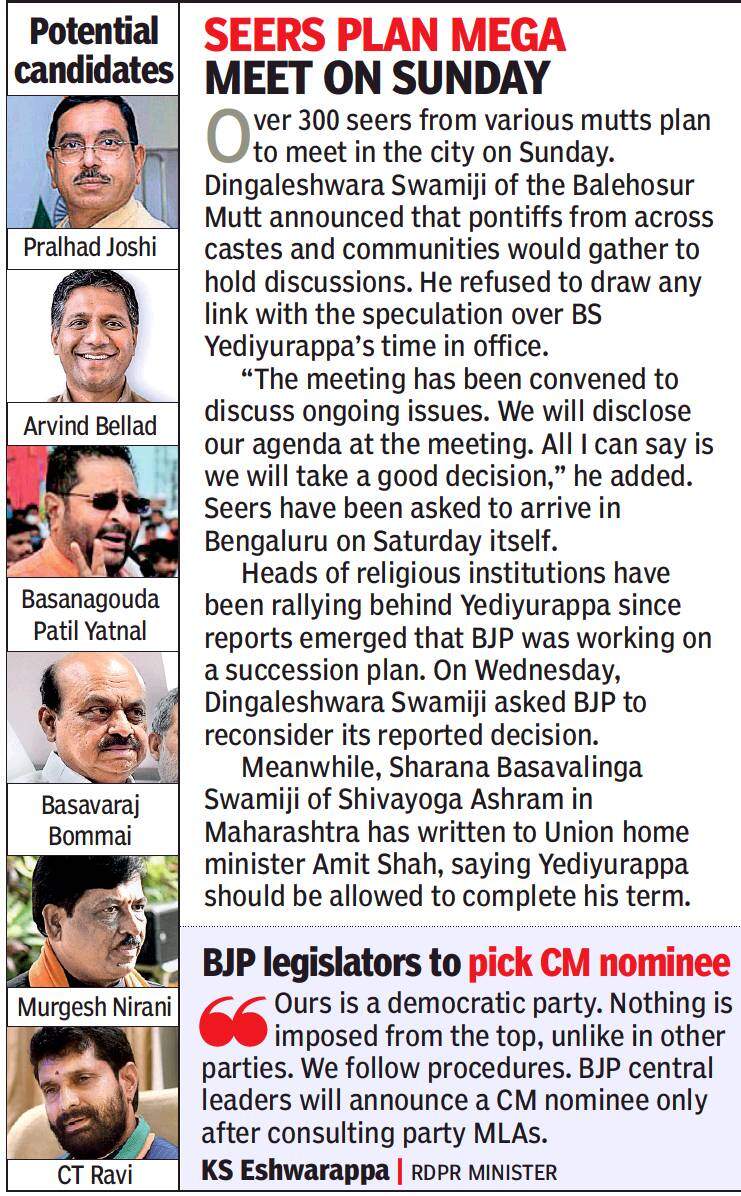 BENGALURU: The BJP brass has a tough task on hand to find an acceptable successor to 78-year-old Lingayat strongman and chief minister BS Yediyurappa if they decide to replace him.