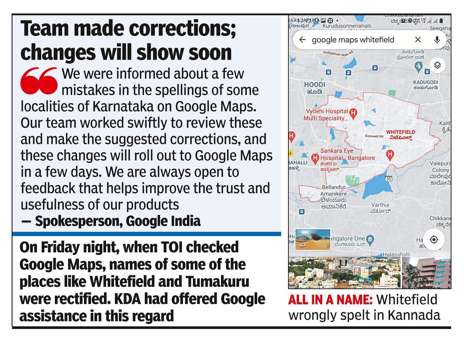BENGALURU: Kannada Development Authority (KDA) chairman TS Nagabharana has written to Google India, Bengaluru, asking the technology major to correct the wrongly spelt names of cities, towns and villages of Karnataka in Kannada on its Google Maps application and web-mapping platform.