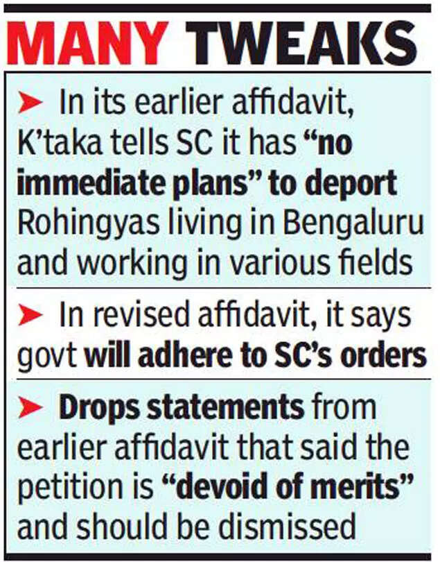 NEW DELHI: Days after opposing a PIL filed by BJP leader and advocate Ashwini Upadhyay for detention and deportation of Rohingya Muslims and stating that it is not planning to deport those living within its territory, the Karnataka government has changed its stand and removed those statements in a revised affidavit.