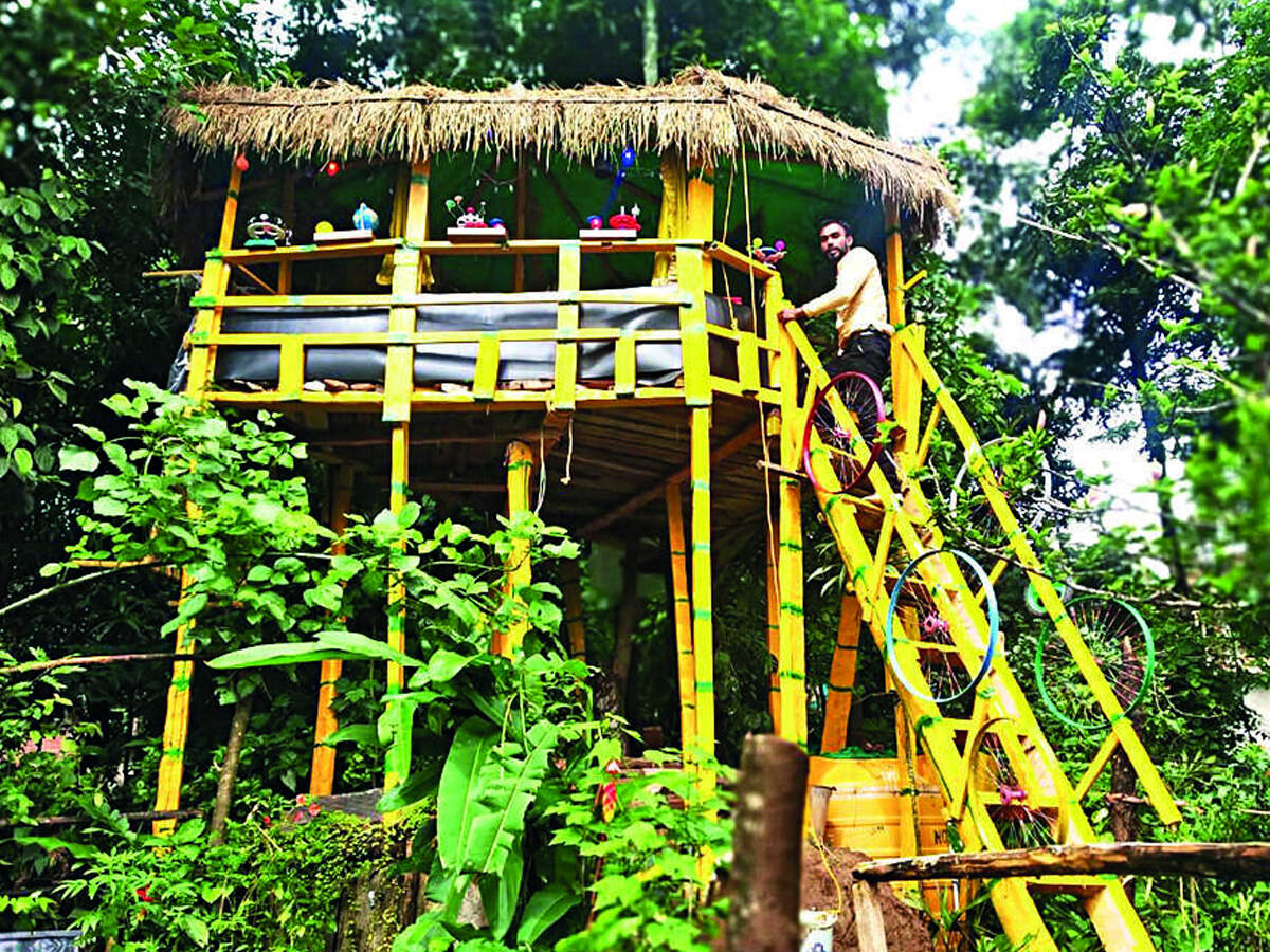 MADIKERI: As all classes went online due to the Covid-induced lockdown after the second wave in April, this teacher from Mullur Village, Somwarpet in Kodagu, about 250km from Bengaluru, found a unique solution to overcome patchy internet issues. C S Satheesha, a 37-year-old government schoolteacher, decided to build a bamboo platform atop a tree so that he could continue to teach kids from his high perch.