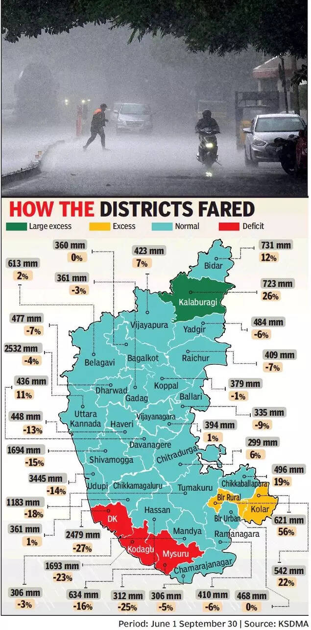 BENGALURU: The rain deficit of Karnataka, as a whole, has shrunk to 8 per cent from a peak of 47 per cent noted at the end of August. In the four months of the southwest monsoon, which officially concluded on Thursday, the state received 787mm of rainfall as against the normal figure of 852mm.