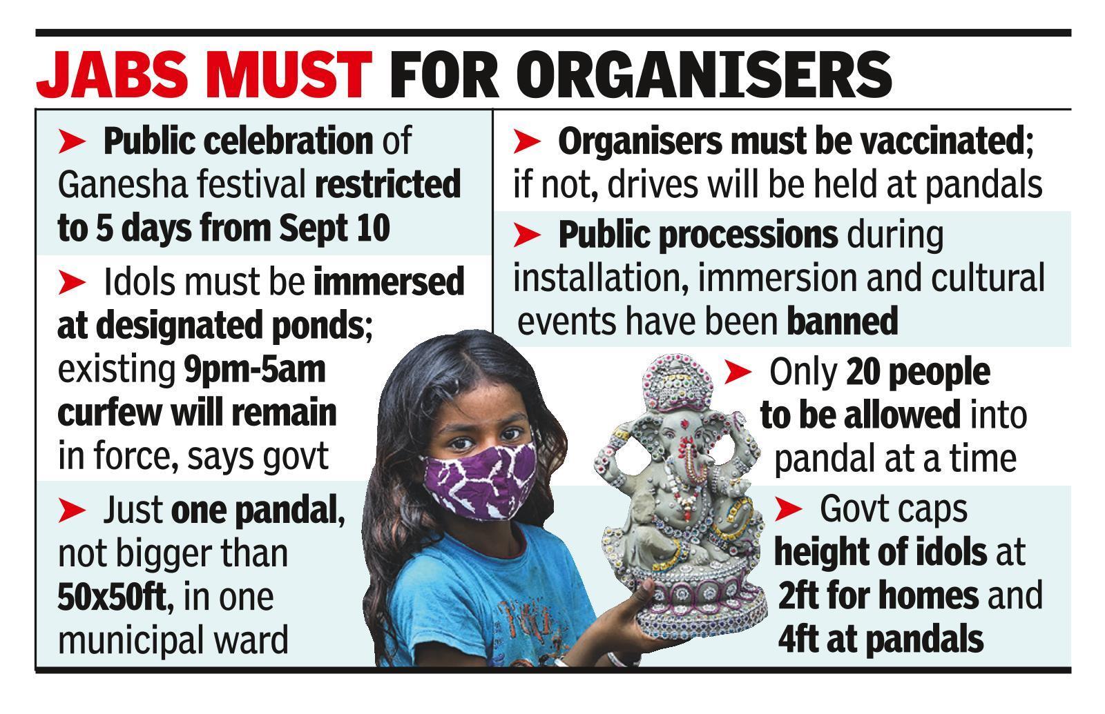 A pandal cannot be bigger than 50x50ft with a cap of 20 visitors at a time, and organisers must be jabbed and have RT-PCR negative certificate.