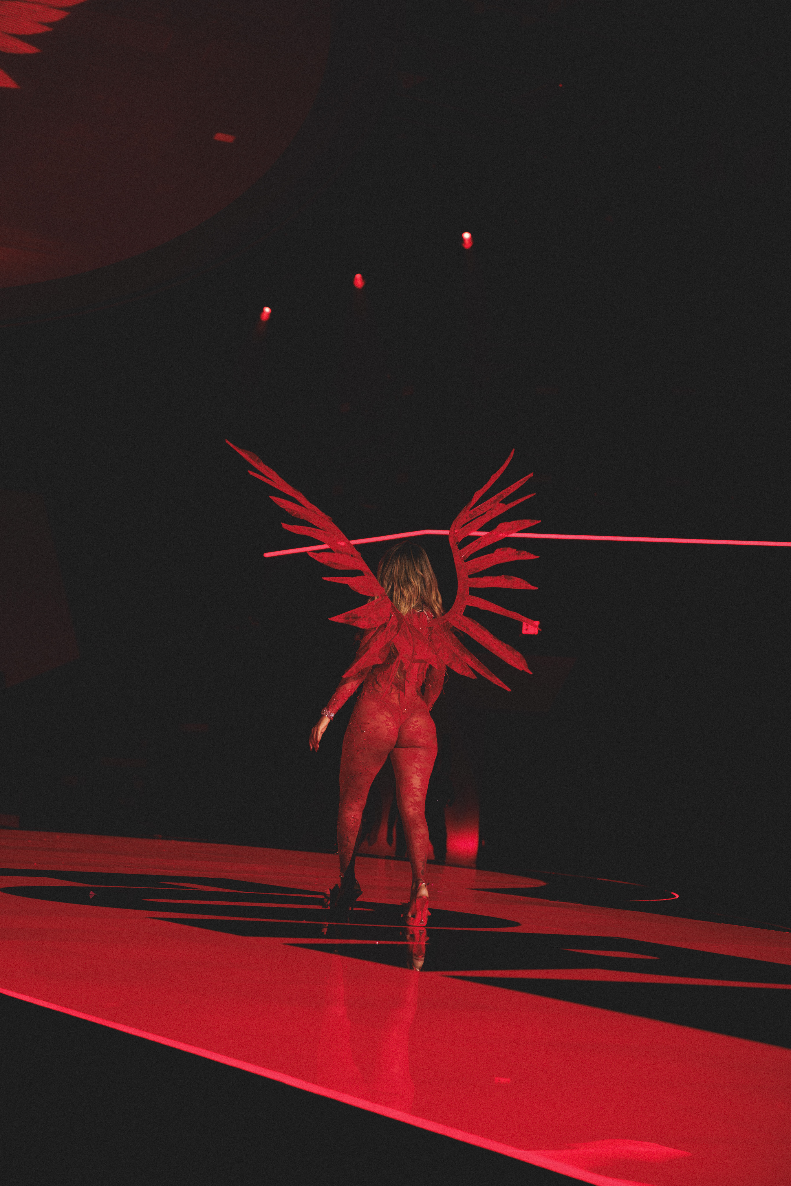 That Victoria's Secret Fashion Show signature only came out during her big finale, as she walked to the end of the stage. Otherwise, Karol G performed in her own twist on the peek-a-boo silhouettes and bombshell glam embellishments the event is known for: She wore a long-sleeve, red lace bodysuit, coated in baroque clusters of intricate red crystals, with a chili pepper satin wrap around her waist.