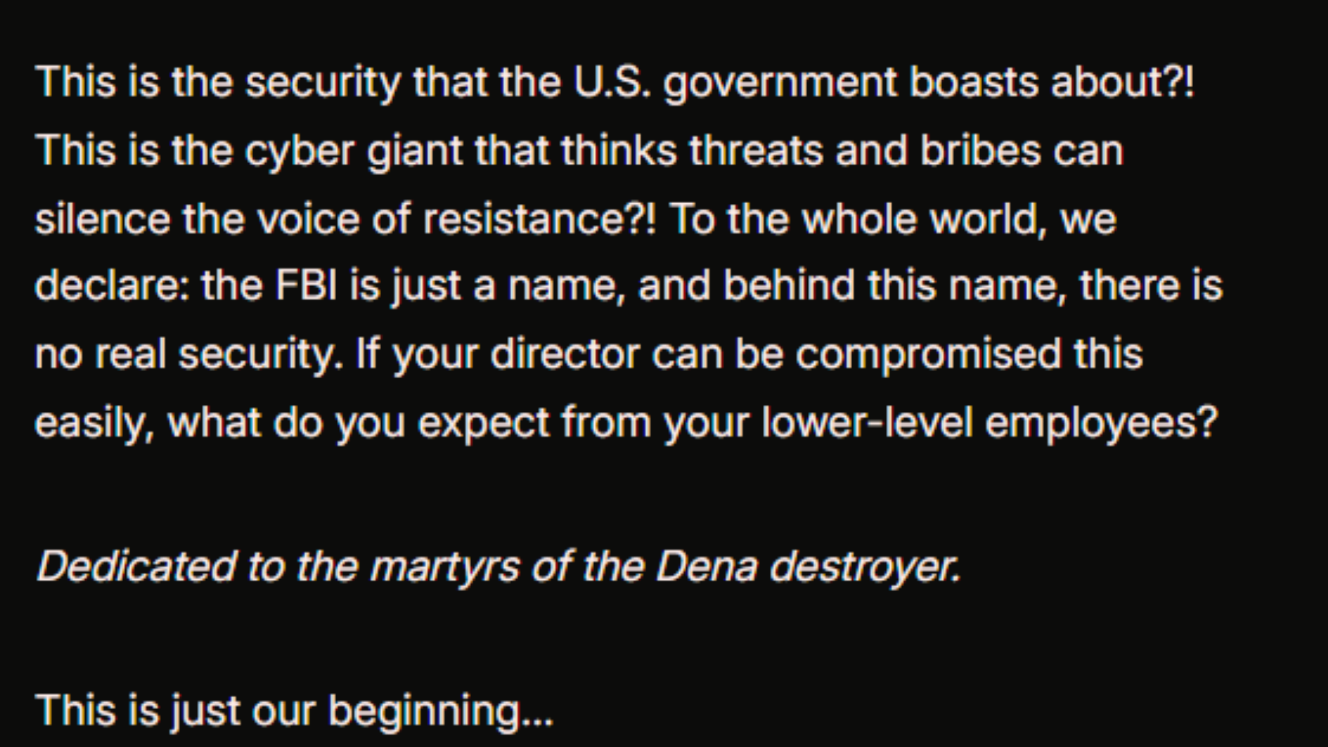 The FBI, keen to cool speculation that the incident posed a live security threat, said through spokesperson Ben Williamson that investigators had taken 'all necessary steps' to mitigate risks. The material, Williamson added, was old and did not touch government networks or national security systems.