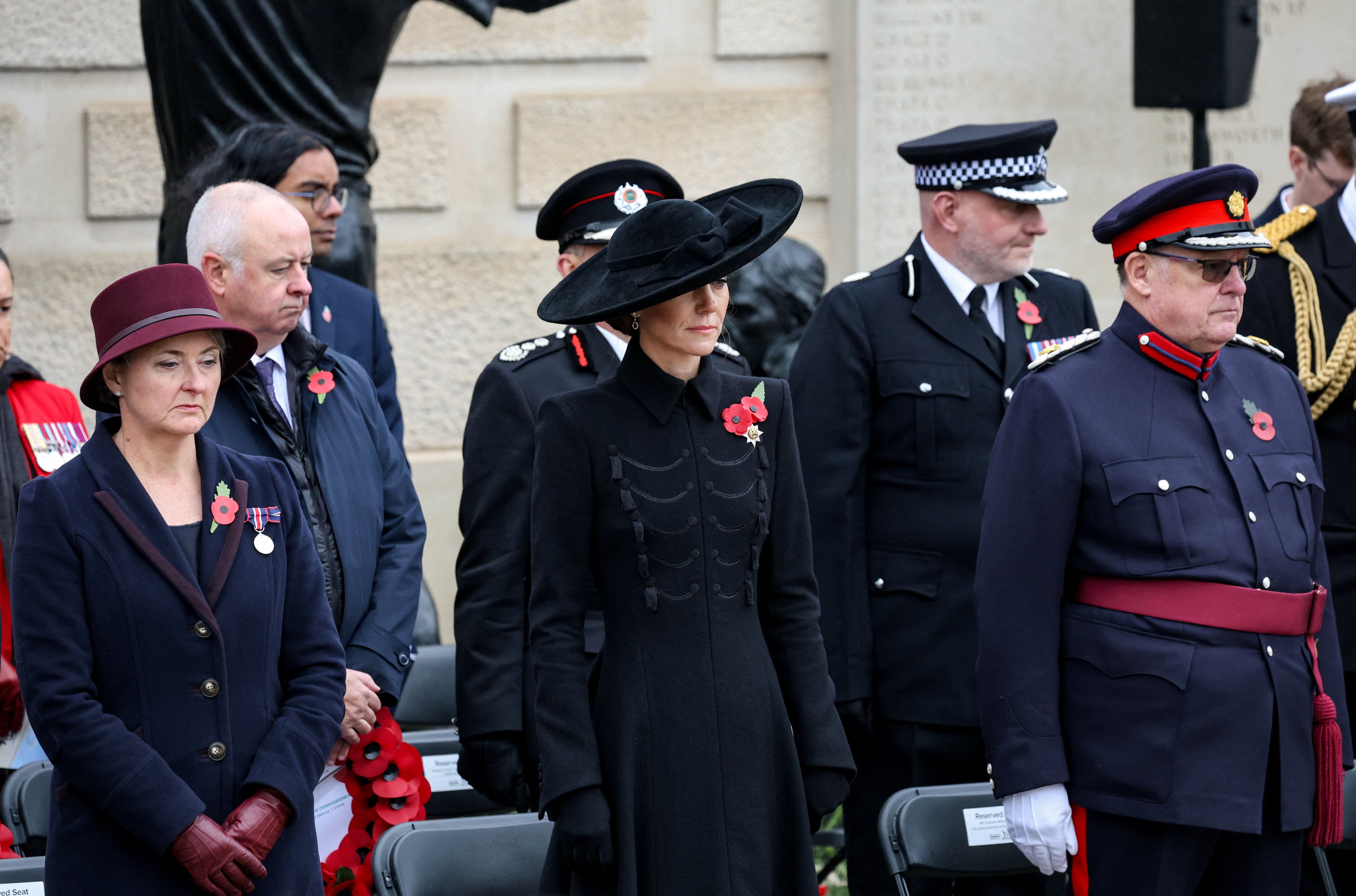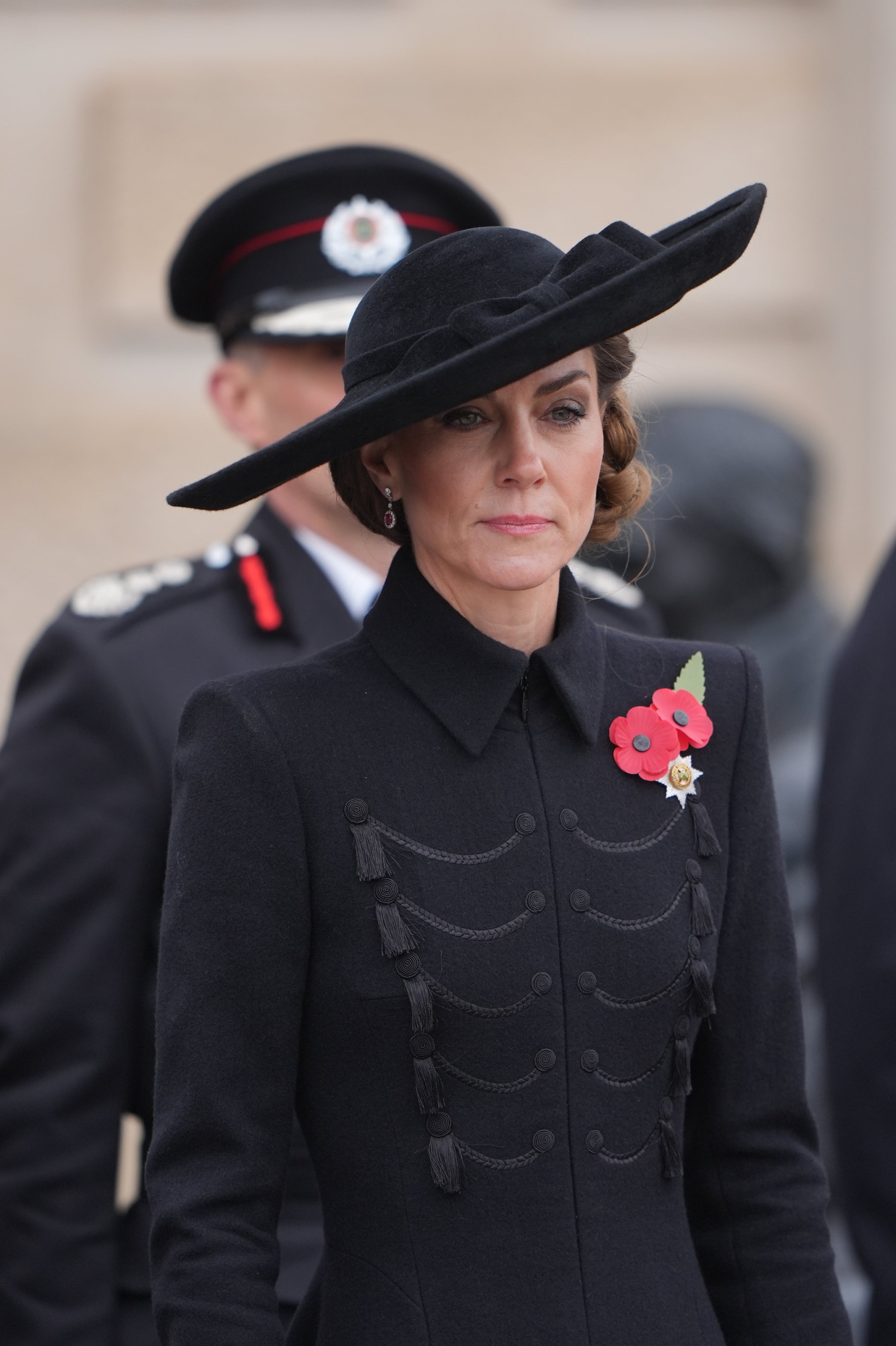 She wore a military-inspired black coat, a wide-brimmed hat adorned with a bow, and two poppies.