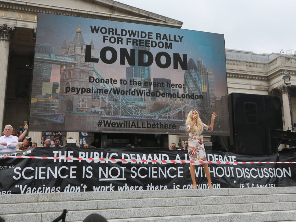 Ms Shemirani, who has frequently compared Britain’s response to coronavirus to Nazi Germany, led Saturday’s protests and introduced other speakers including conspiracy theorists David Icke and Piers Corbyn, and far-right activist Katie Hopkins.