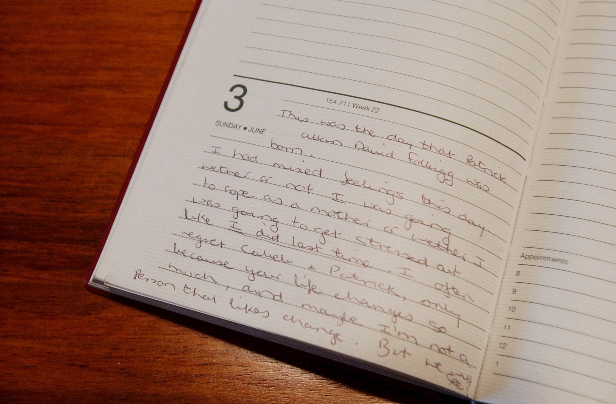 June 3, 1990: "This was the day that Patrick Allan David Folbigg was born. I had mixed feelings this day. wether or not I was going to cope as a mother or wether I was going to get stressed out like I did last time . I often regret Caleb & Patrick, only because your life changes so much, and maybe I'm not a Person that likes change. But we will see?"