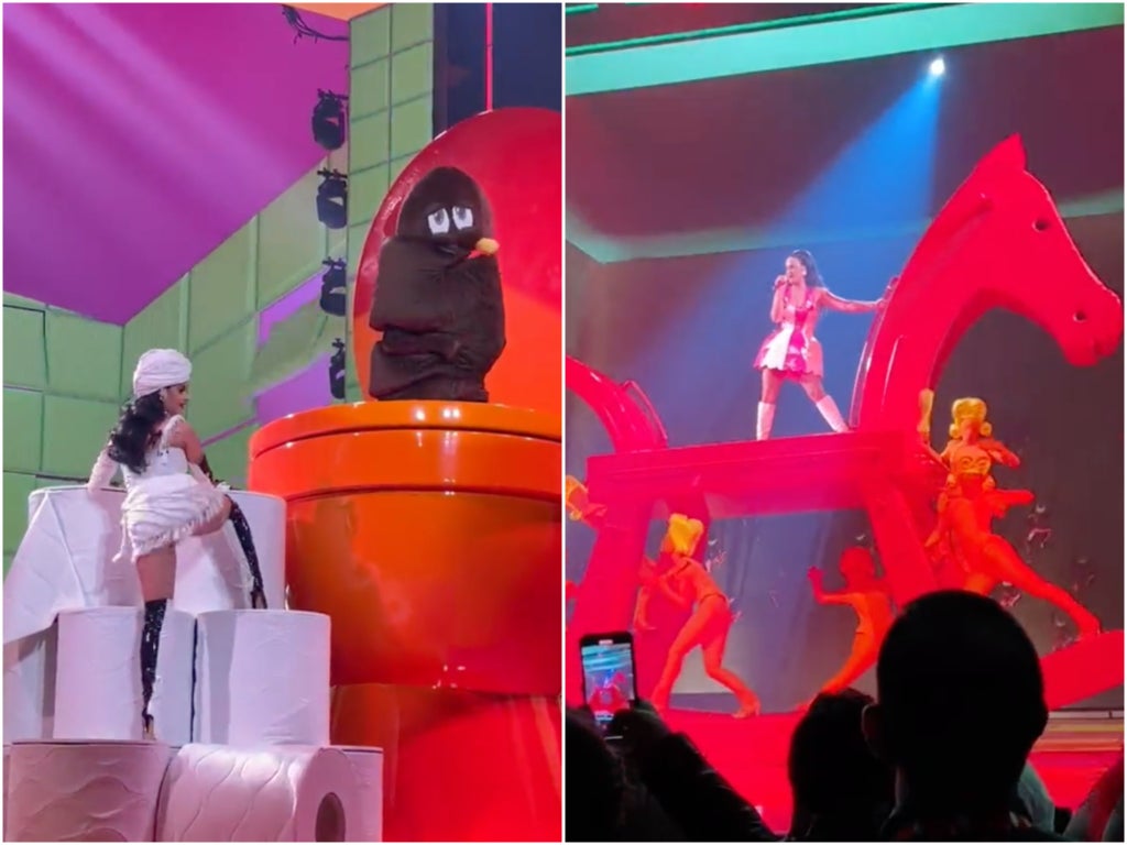 Another set piece widely shared on social media comes during Perry’s rendition of “California Gurls”, in which she twerks on a giant loo roll next to a talking toilet that contains a dancing poo.