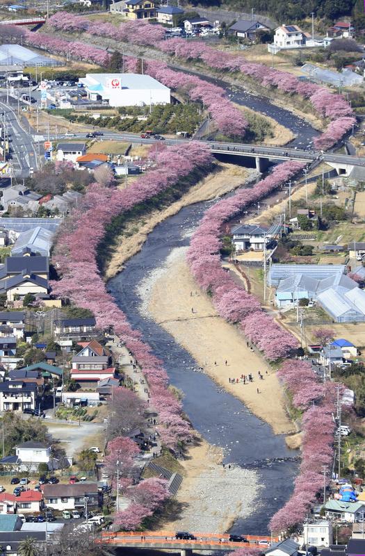 SHIZUOKA -- Now is about the best time to see the Kawazu-zakura cherry trees, which are known to bloom early, in Kawazu, Shizuoka Prefecture. Tourists enjoy seeing the about 850 cheery trees that grow along the Kawazu River with their deep pink flowers. This year, due to the warm winter, the cherry trees started blooming about a week earlier than usual. Currently, the trees are either at three-quarter bloom or full bloom.