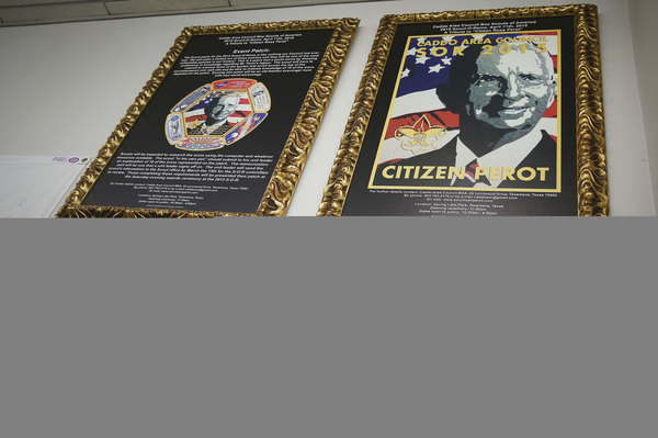 "That's from the trouble-making women here in the office that I've had to put up with all my life," Perot says, a reference to longtime loyalists, including Libby Craft, who's helping with the tour. "Look close. That's duct tape (used as the medium). It's awful, isn't it?" he asks delightedly.