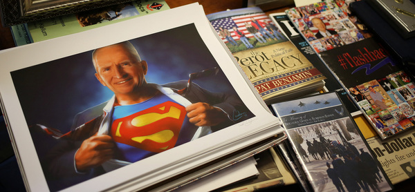 "Somebody had all these made and gave them to me," he says, patting a stack of sheets with his face on Superman's body. "Nobody wants them," he laughs heartily.