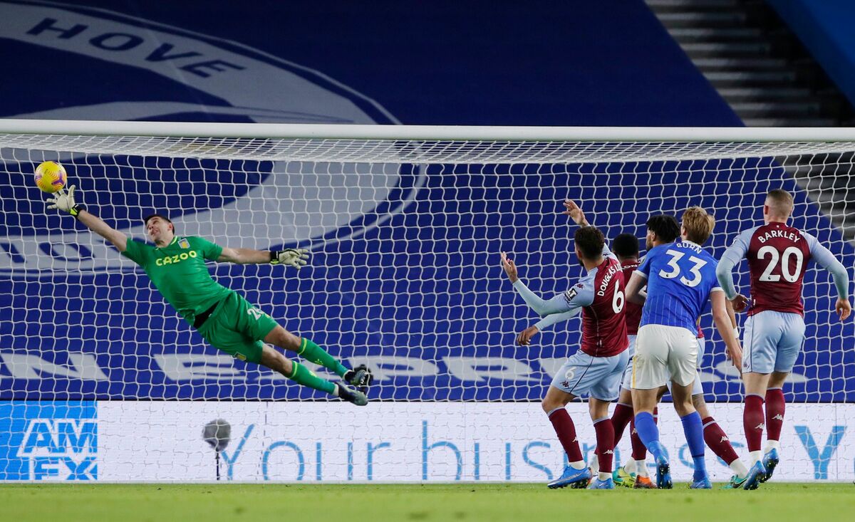 Goalkeeper Emiliano Martinez pulled off a string of superb saves to grab an unlikely point for Aston Villa in a 0-0 draw away to a dominant Brighton & Hove Albion that saw the Seagulls extend their unbeaten run in the Premier League to six games.