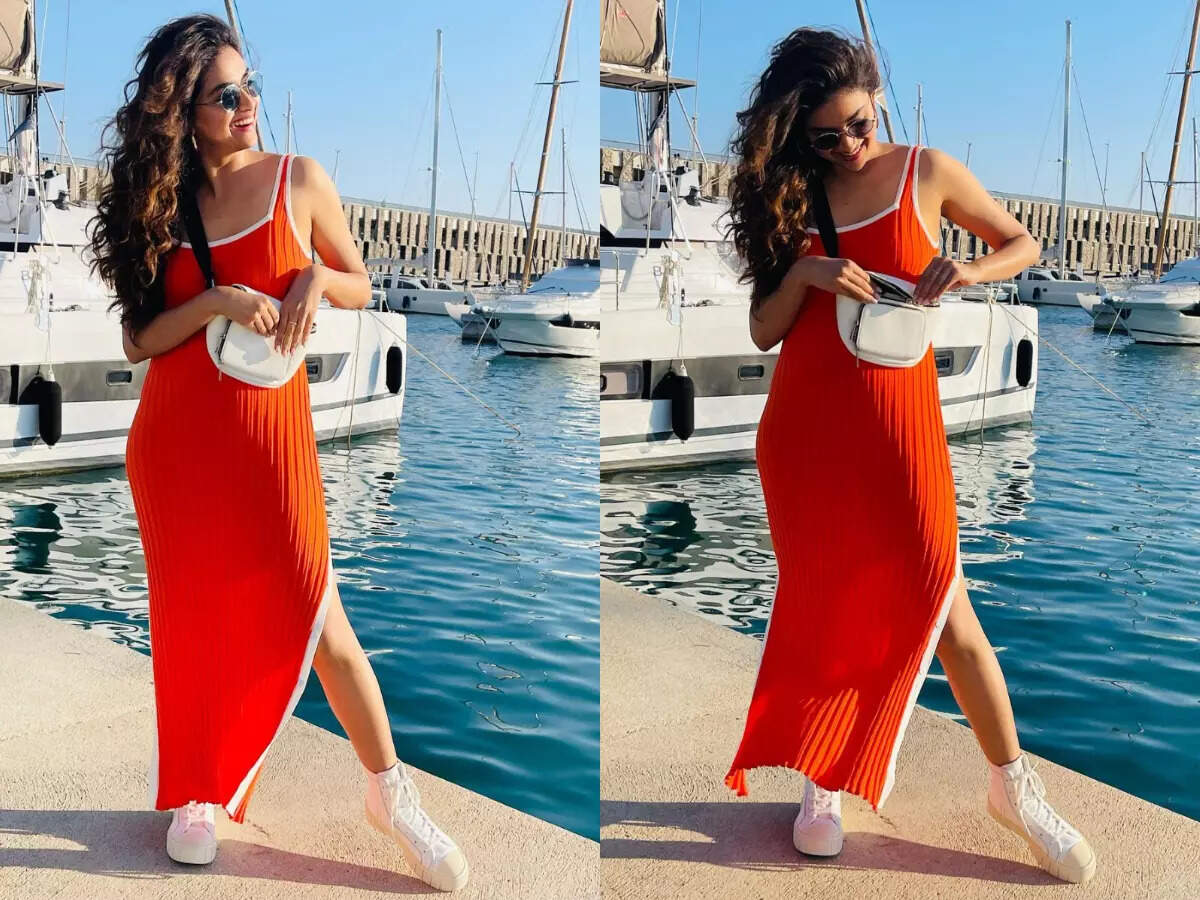 The actress was clicked by the harbour, looking all chic in a bright orange midi dress. Keerthy flaunted the Kimberly side-slit ribbed-jersey midi dress from Solid & Striped and boy, she looked hot!