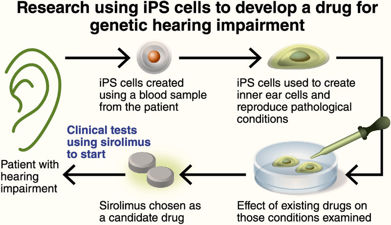 A Keio University research team used induced pluripotent stem (iPS) cells to discover a candidate drug for treating a genetic hearing impairment, and will start clinical tests in May to confirm its effectiveness, the university has announced.