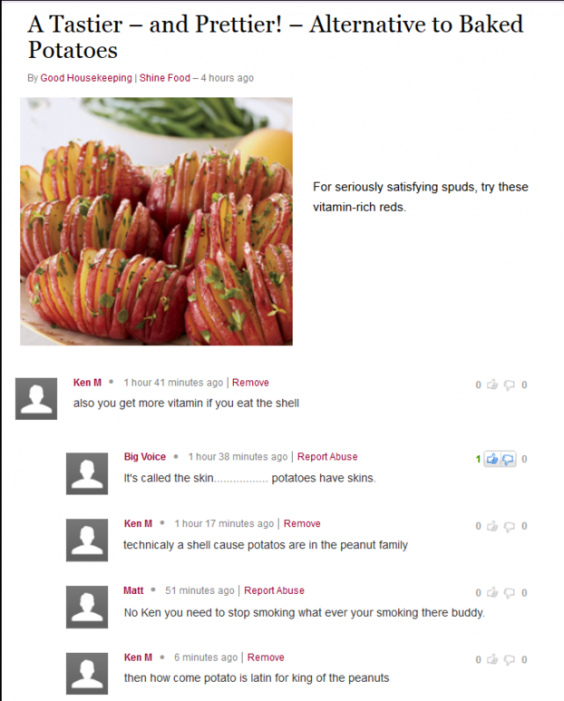 “Yahoo has the most beautifully gullible people. The people on Huffington Post are humorless and pedantic. I tried it with Fox News, but that group is such a furious wasp nest.”