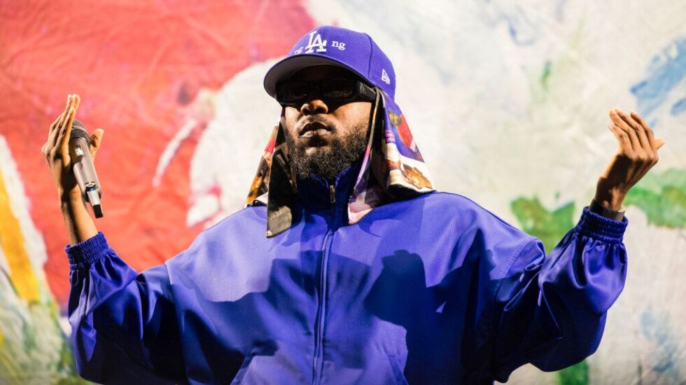 On this night, Lamar was overtly minimalist. He appeared on stage sans any superfluous stage props other than a large mural backdrop in the beginning, some strobes and smoke effects, while wearing a blue jumpsuit and Dodgers-style cap representing pgLAng — his new entertainment company and label he created with Dave Free in 2020.